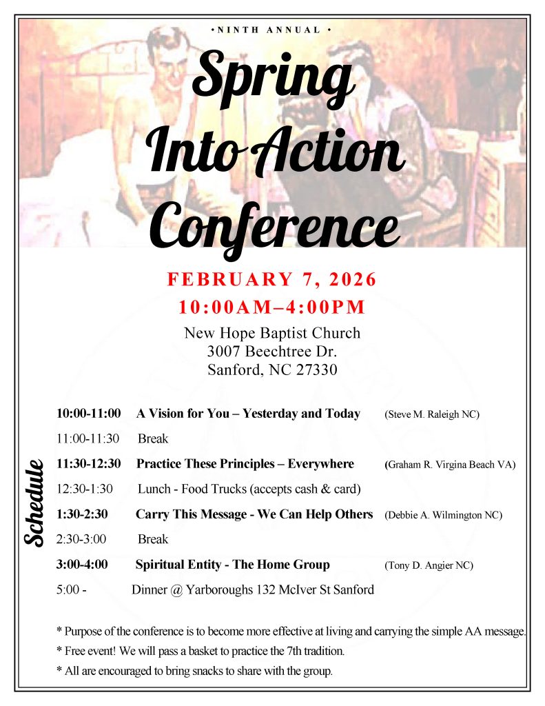 Spring into Action Calendar Add to Calendar Add to Timely Calendar Add to Google Add to Outlook Add to Apple Calendar Add to other calendar Export to XML When: February 7, 2026 @ 10:00 am – 4:00 pm 2026-02-07T10:00:00-05:00 2026-02-07T16:00:00-05:00 Where: New Hope Church 3007 Beechtree Dr Sanford, NC 27330 USA